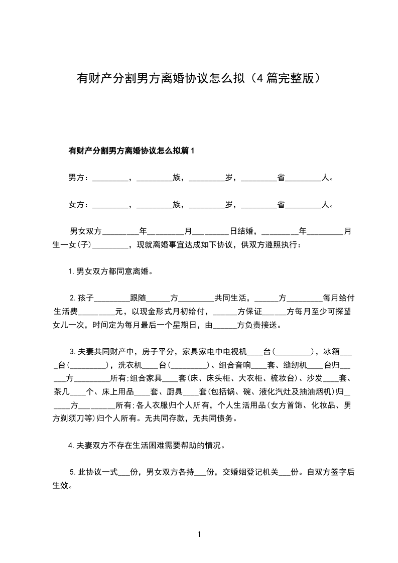 1、【存款】双方婚姻关系存续期间,目前共有存款____元,其中男方账户____元,女方账户____元,双方同意,____方在本协议签订之日起3日内给付____方____元。