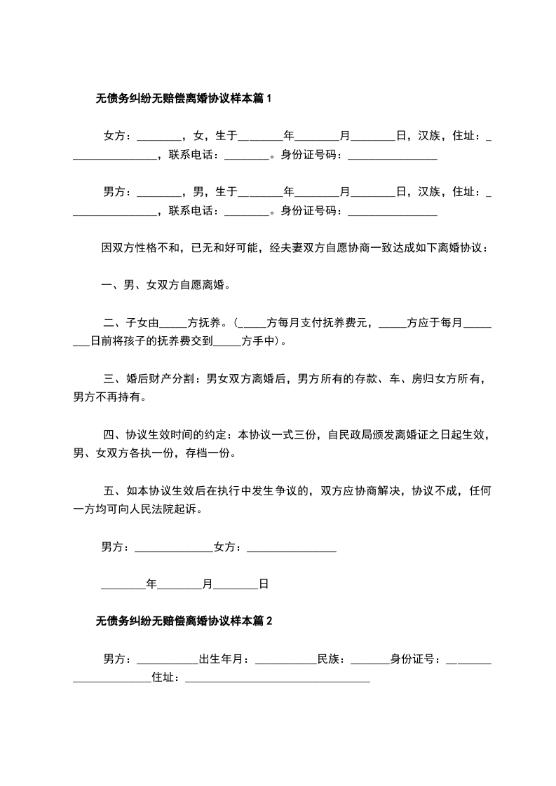 无债务纠纷无赔偿离婚协议参考样式篇2