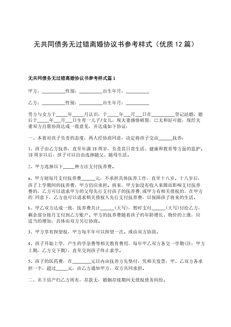 无共同债务无过错离婚协议格式篇12
