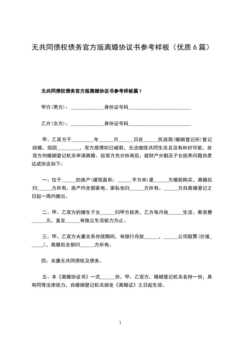 无共同债权官方版协议离婚书篇6