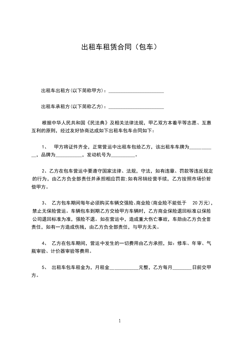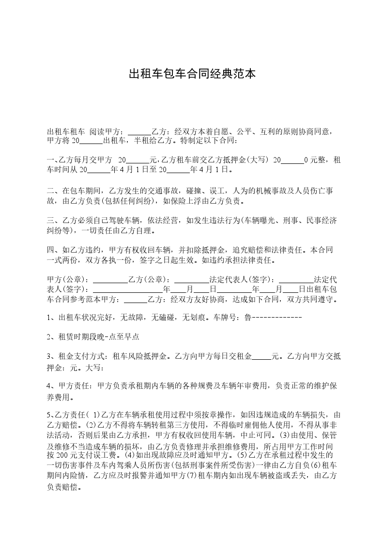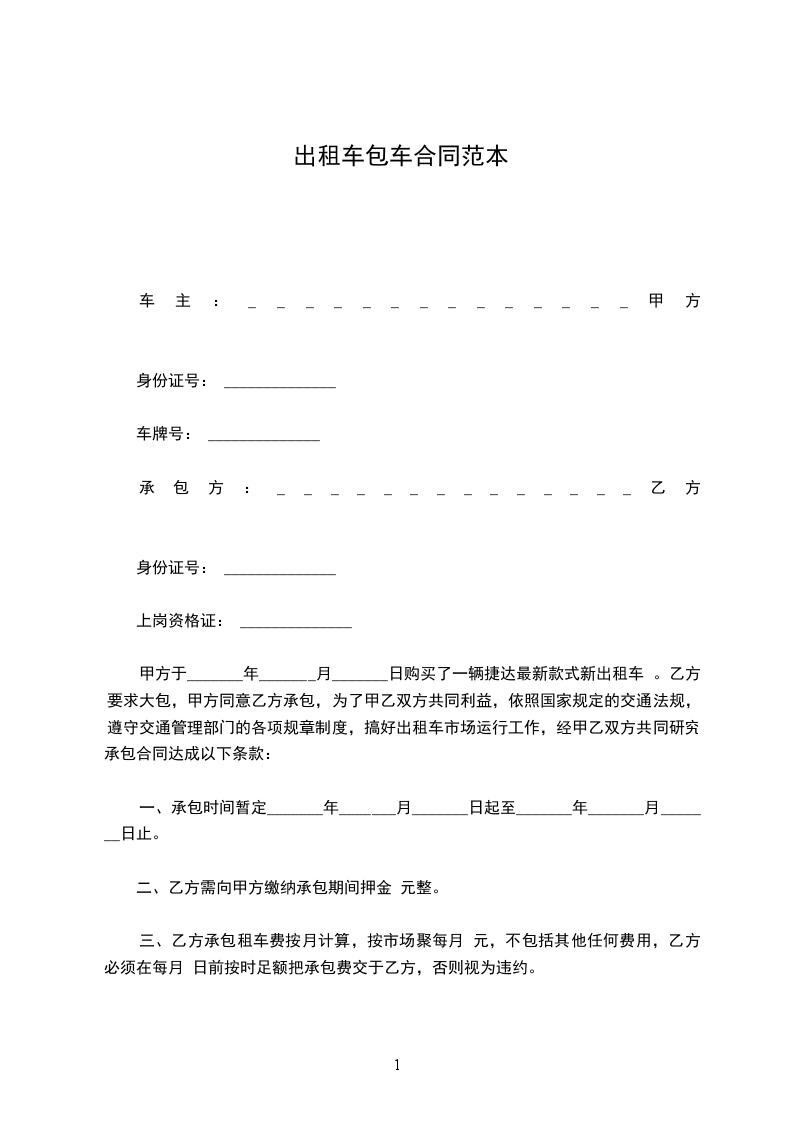 甲方于_______年_______月_______日购买了一辆捷达最新款式新出租车 。乙方要求大包,甲方同意乙方承包,为了甲乙双方共同利益,依照国家规定的交通法规,遵守交通管理部门的各项规章制度,搞好出租车市场运行工作,经甲乙双方共同研究承包合同达成以下条款: