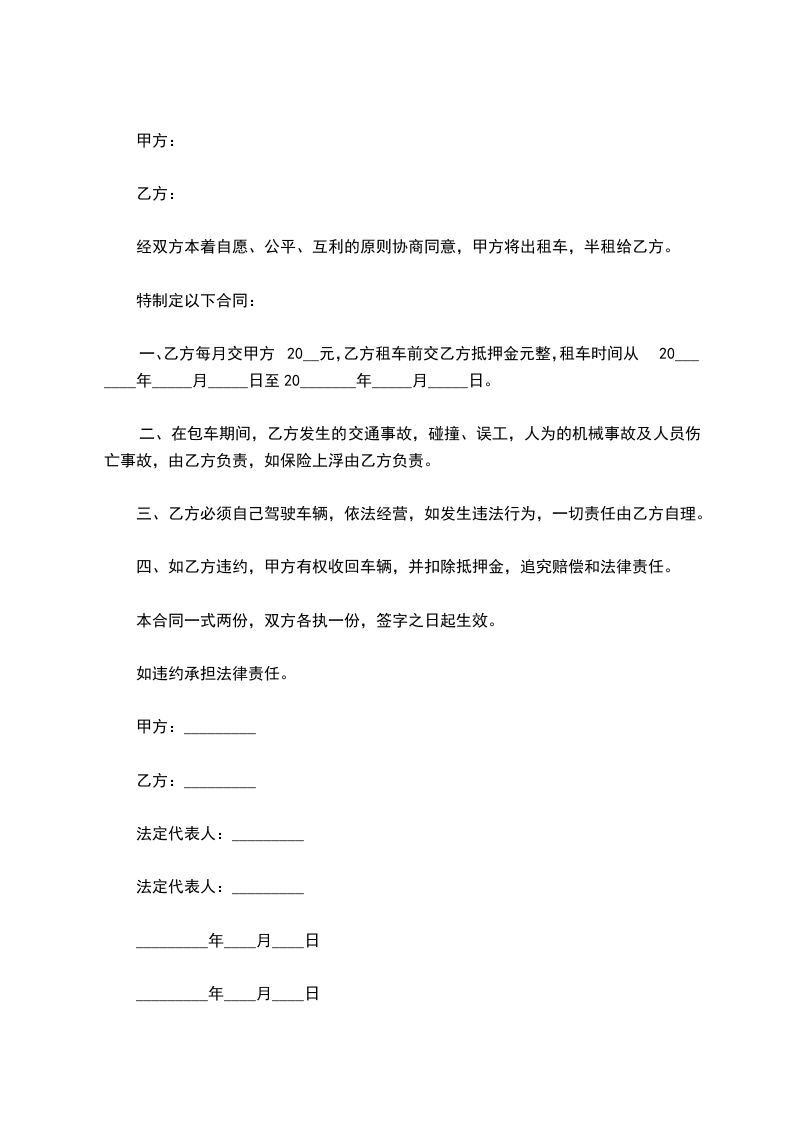 三、乙方承包租车费按月计算,按市场聚每月 元,不包括其他任何费用,乙方必须在每月 日前按时足额把承包费交于乙方,否则视为违约。