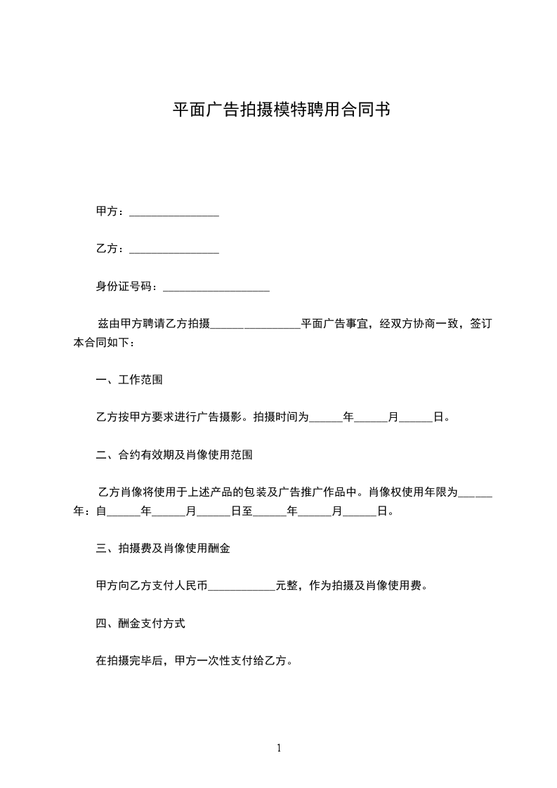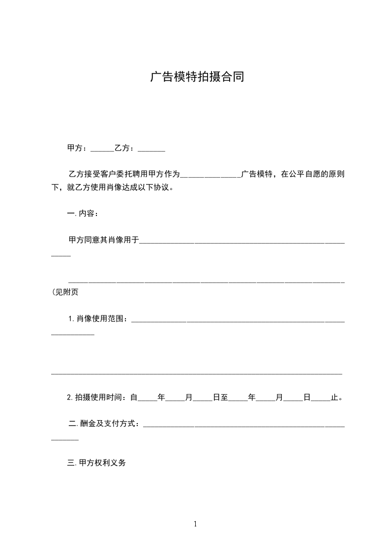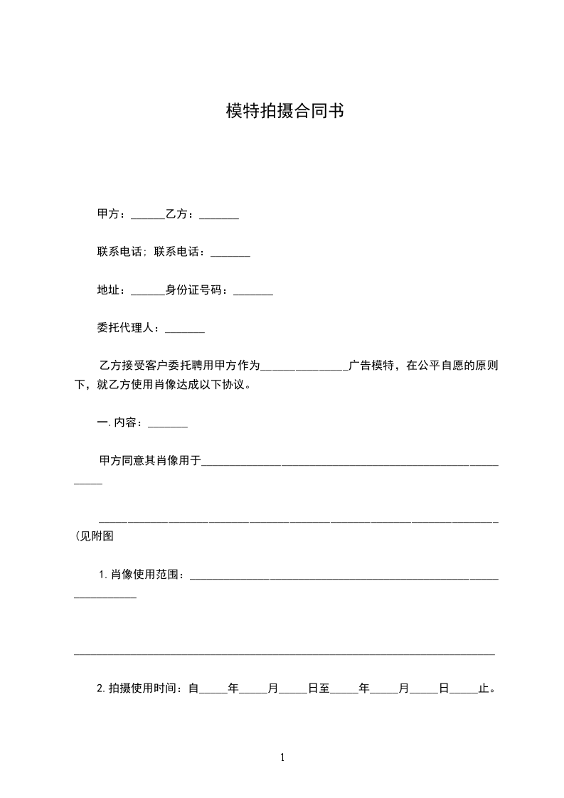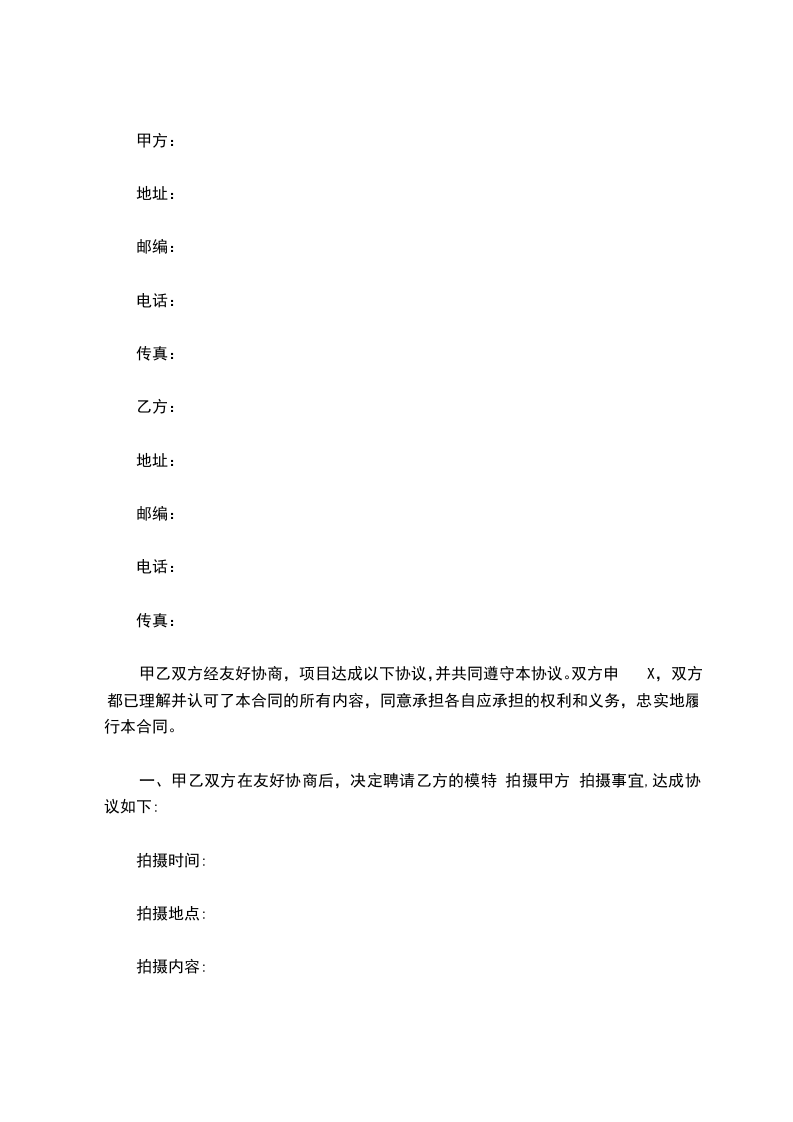 一、甲乙双方在友好协商后,决定聘请乙方的模特 拍摄甲方 拍摄事宜,达成协议如下: