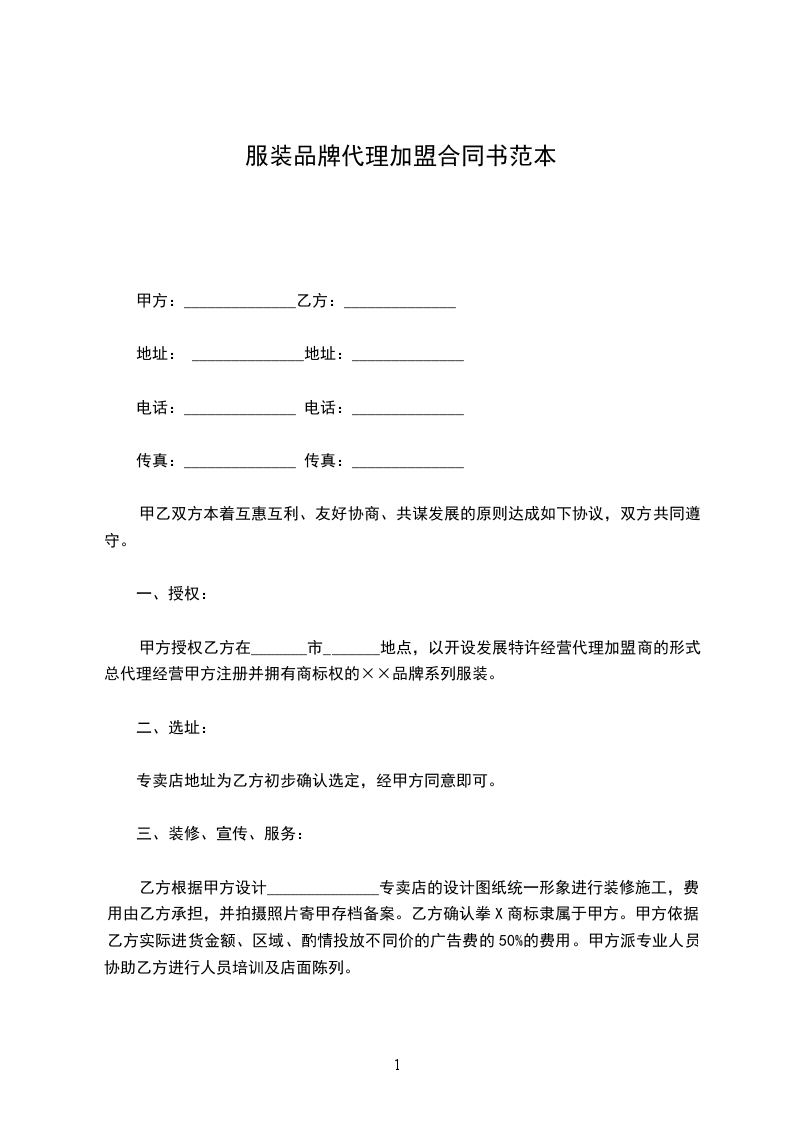甲方授权乙方在_______市_______地点,以开设发展特许经营代理加盟商的形式总代理经营甲方注册并拥有商标权的××品牌系列服装。