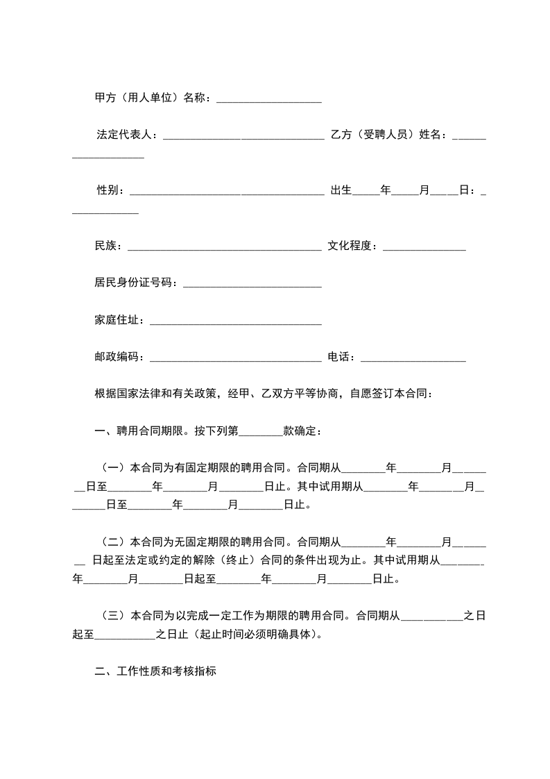 (二)本合同为无固定期限的聘用合同。合同期从________年________月________ 日起至法定或约定的解除(终止)合同的条件出现为止。其中试用期从________年________月________日起至________年________月________日止。