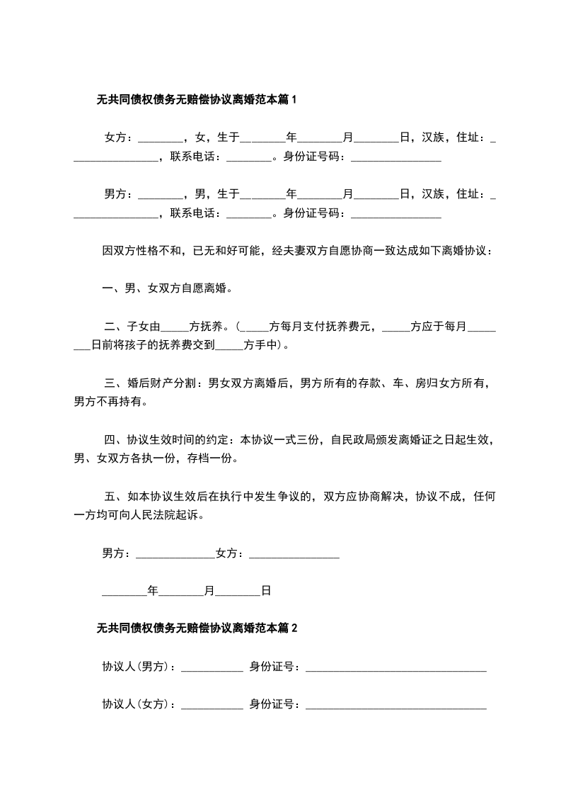 无共同债权债务无赔偿协议离婚范本篇2