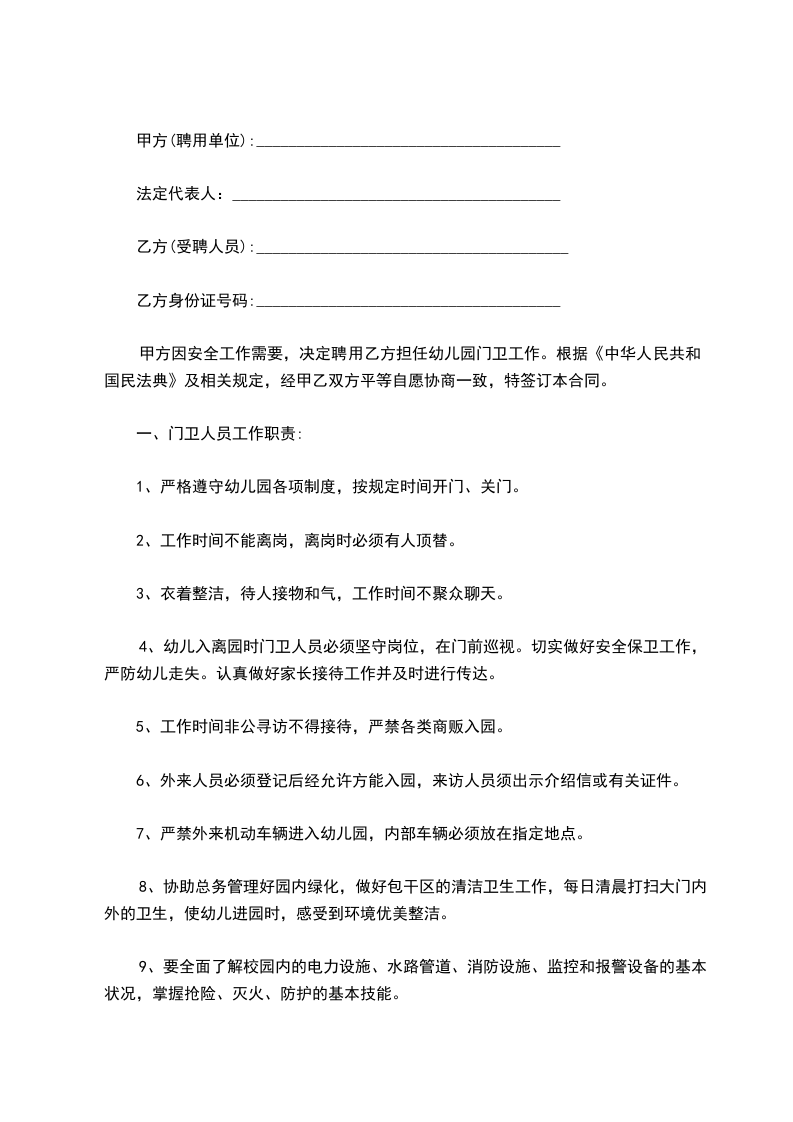一、 协议期限 甲方聘用乙方在甲方 (忠义庄幼儿园)担任门卫工作。协议期限自XX年 XX月XX日至XX年XX月XX日止。