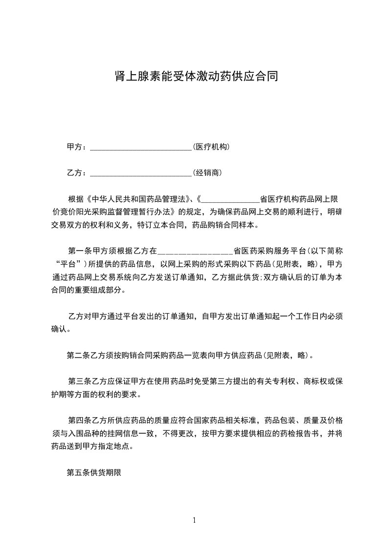 第一条甲方须根据乙方在__________________省医药采购服务平台(以下简称“平台”)所提供的药品信息,以网上采购的形式采购以下药品(见附表,略),甲方通过药品网上交易系统向乙方发送订单通知,乙方据此供货;双方确认后的订单为本合同的重要组成部分。
