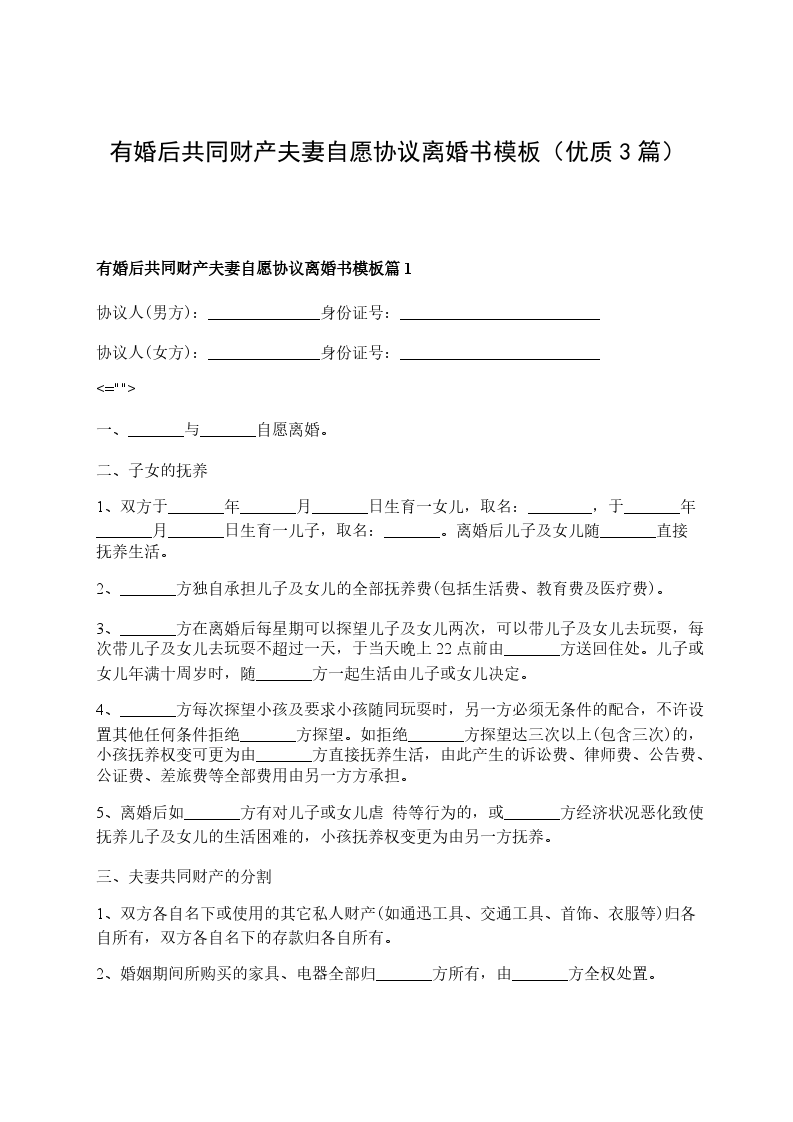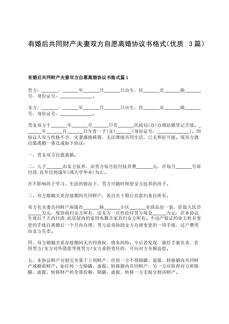 有婚后共同财产自愿离婚协议模板篇3