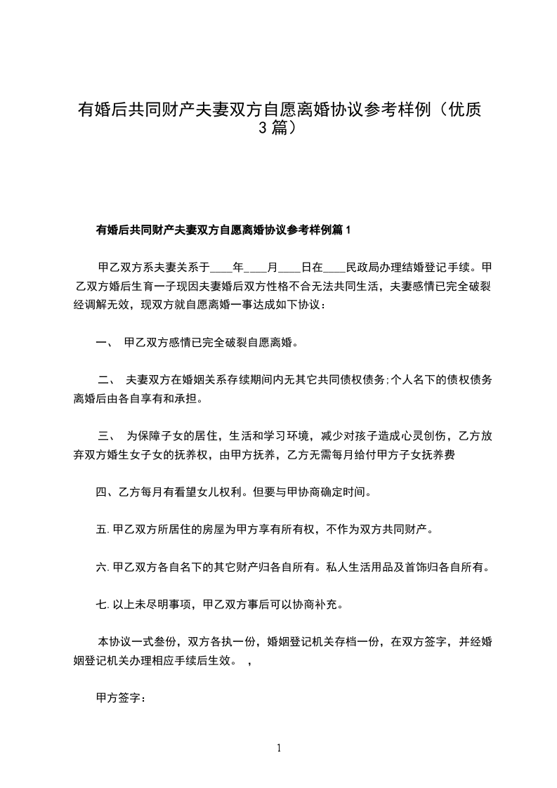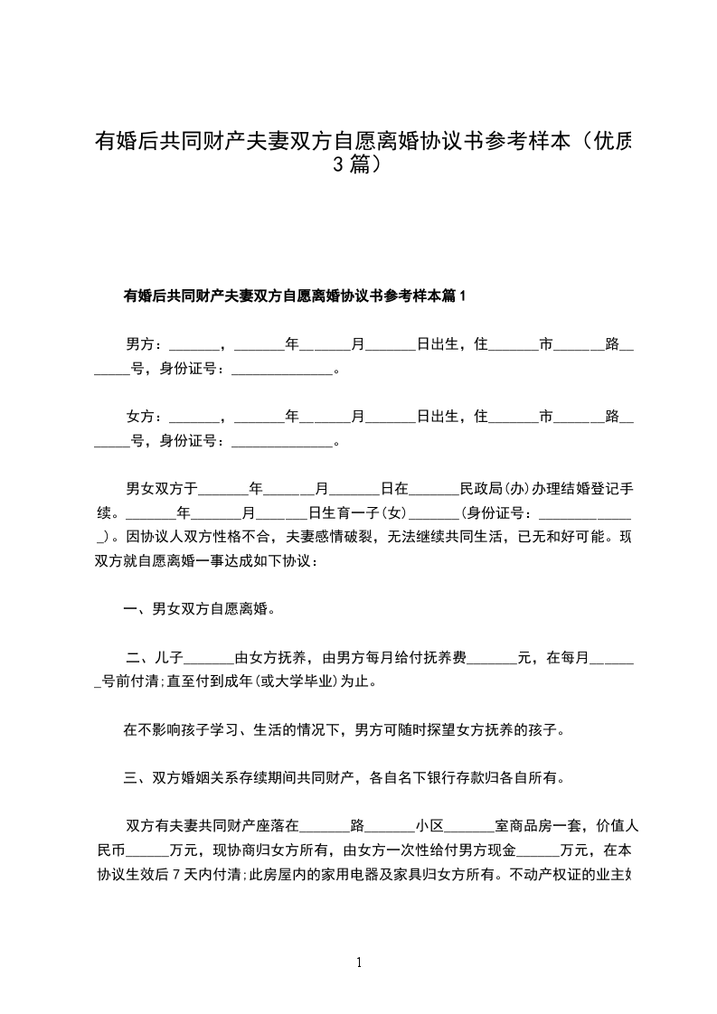 有婚后共同财产自愿离婚协议模板篇1