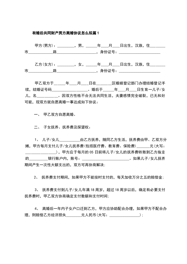 有婚后共同财产男方离婚协议怎么拟篇5