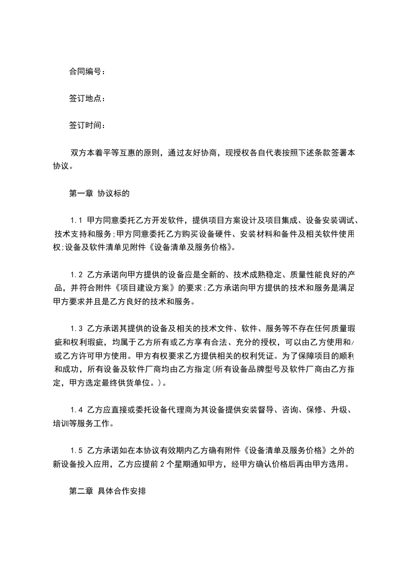 1.1 甲方同意委托乙方开发软件,提供项目方案设计及项目集成、设备安装调试、技术支持和服务;甲方同意委托乙方购买设备硬件、安装材料和备件及相关软件使用权;设备及软件清单见附件《设备清单及服务价格》。