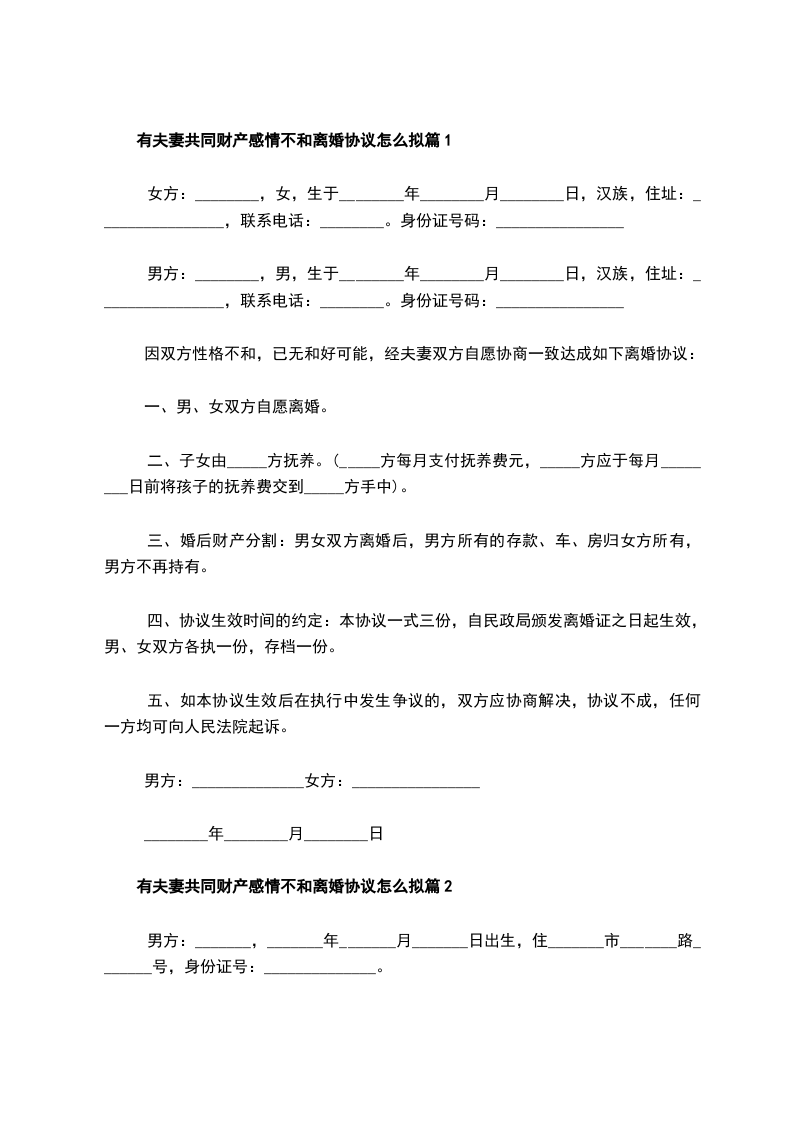 有财产感情不和协议离婚范本怎么拟篇2