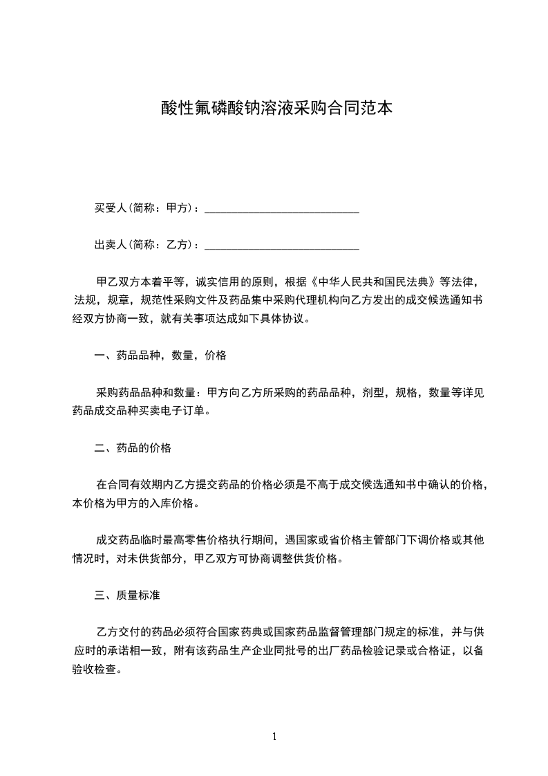 根据《中华人民共和国民法典》,甲、乙双方经协商确定,甲方向乙方购买药品。为明确双方责任和权利,特签订本合同,共同遵守。具体条款如下: