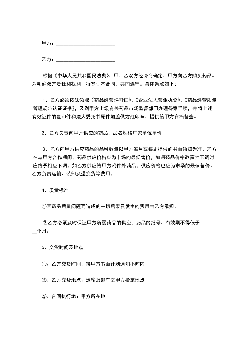 根据《中华人民共和国民法典》,甲、乙双方经协商确定,甲方向乙方购买药品。为明确双方责任和权利,特签订本合同,共同遵守。具体条款如下: