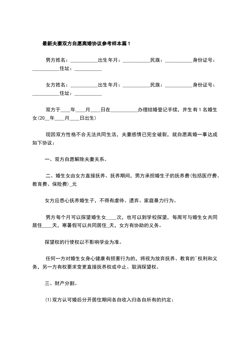 双方于 __年__月__日在__市__城区(县)人民政府的民政部门登记结婚,现因______(注:指感情不和等)的原因,自愿离婚,经双方协商一致,对有关事项,依《民法典》的规定达成如下自愿离婚协议书: