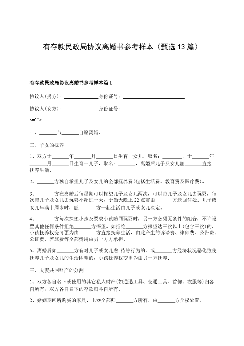 有存款民政局协议离婚书参考样本篇13