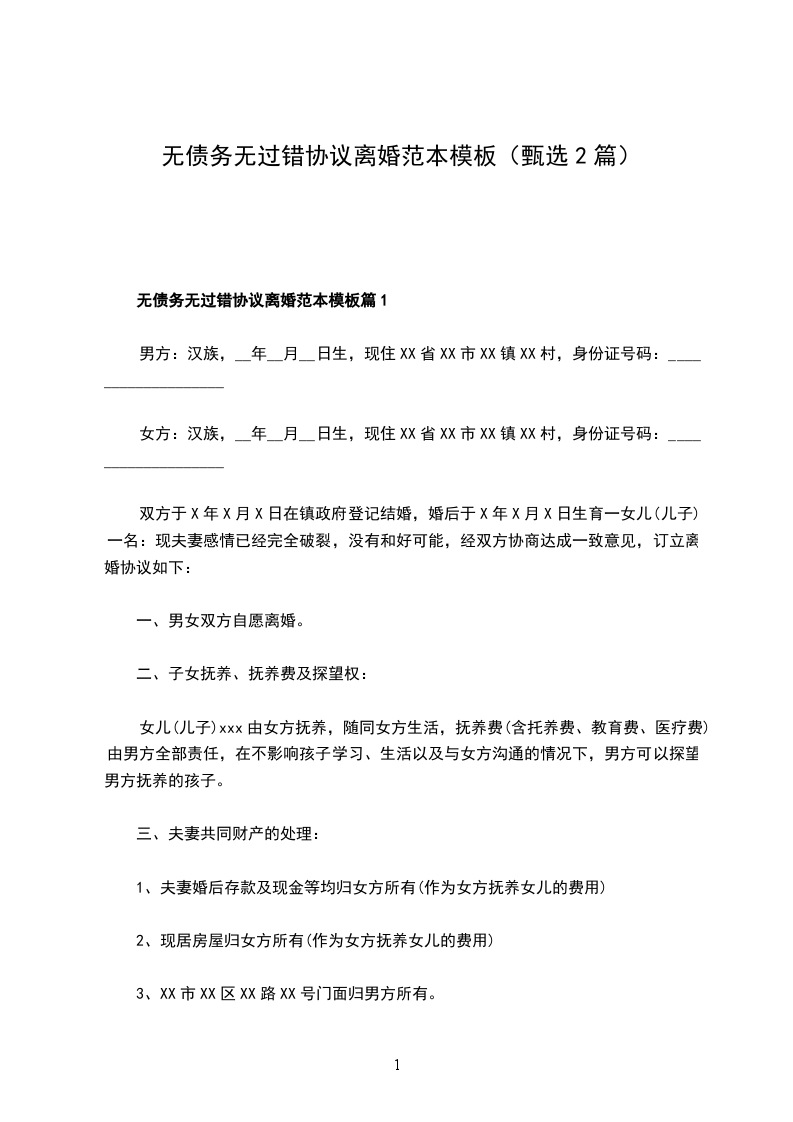 无债务无过错协议离婚范本模板篇1