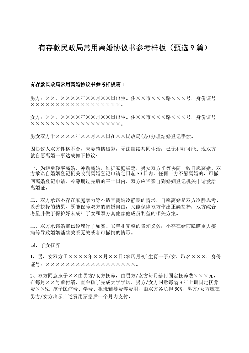 (1)存款:双方名下现有银行存款共_元,双方各分一半,为_元。各自名下的存款保持不变。