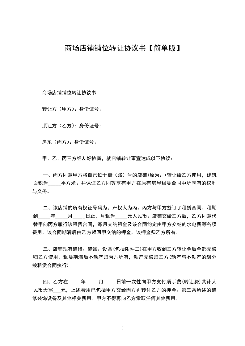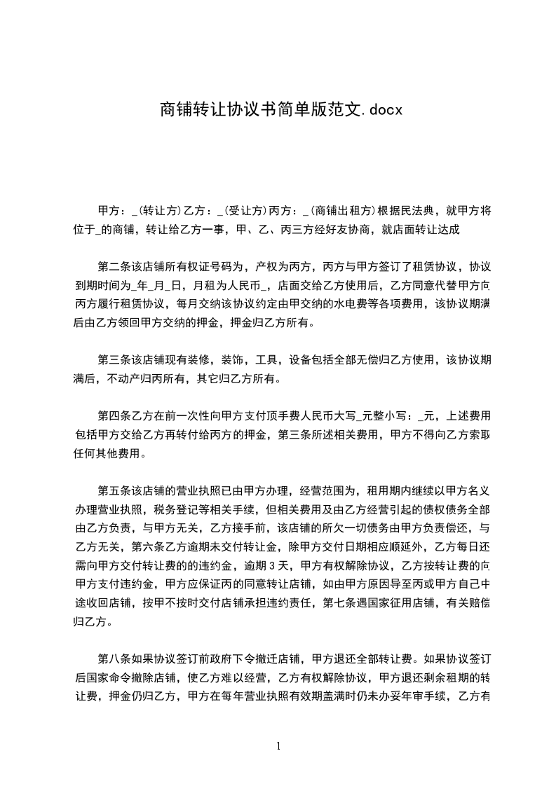 第一条甲方于_____年_____月_____日前将位于________________店铺(面积为__平方米)转让给乙方使用。