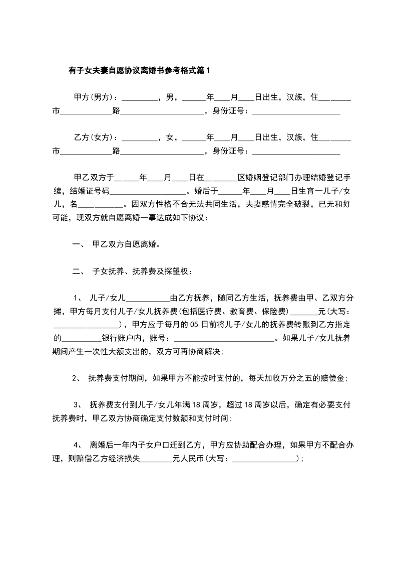 有子女夫妻自愿协议离婚书参考格式篇2
