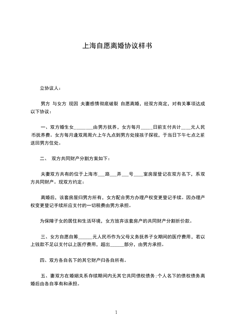男方 与女方 现因 夫妻感情彻底破裂 自愿离婚,经双方商定,对有关事项达成以下协议: