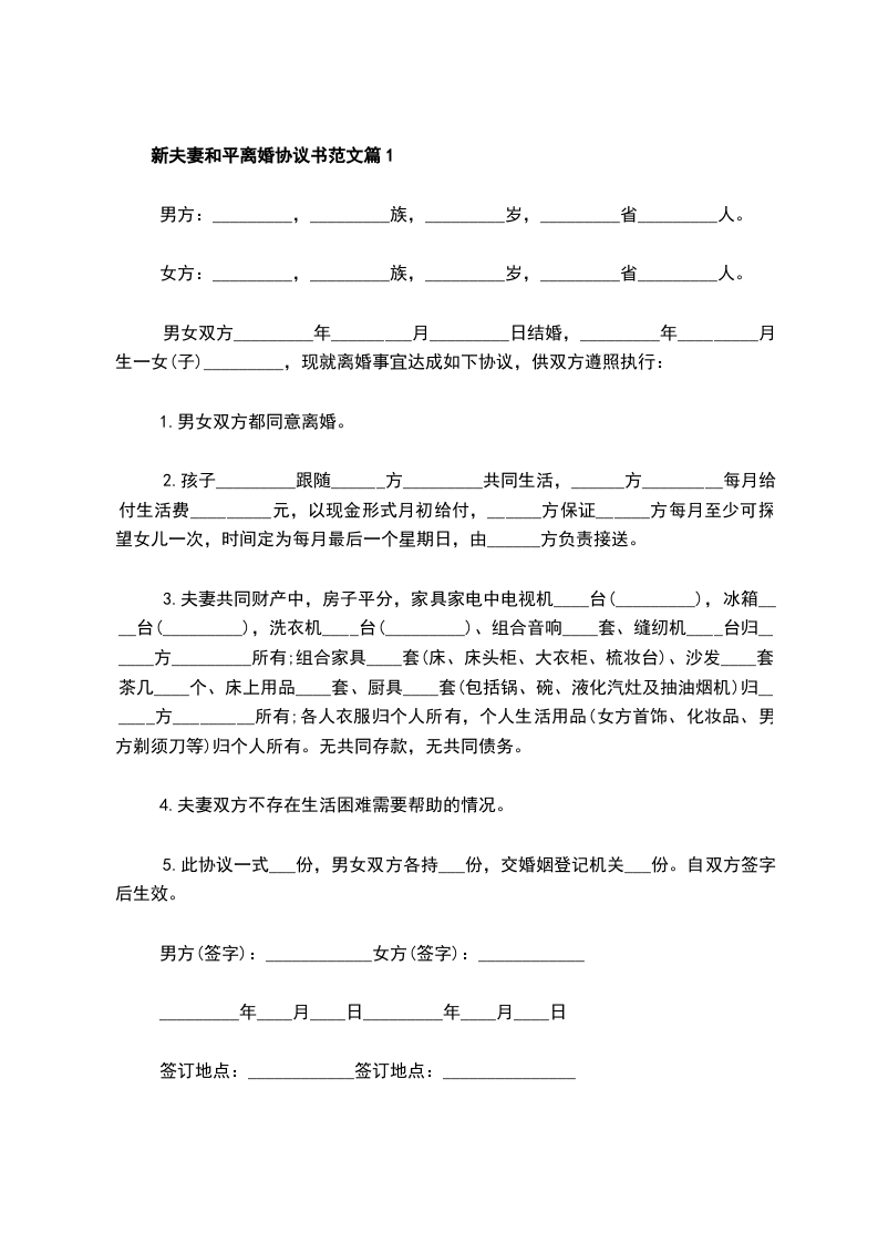 新夫妻和平离婚协议书范文篇1