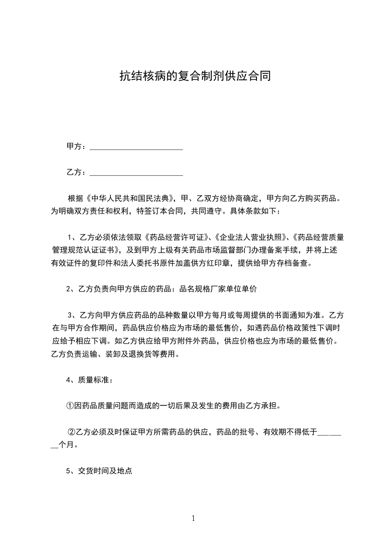 根据《中华人民共和国民法典》,甲、乙双方经协商确定,甲方向乙方购买药品。为明确双方责任和权利,特签订本合同,共同遵守。具体条款如下: