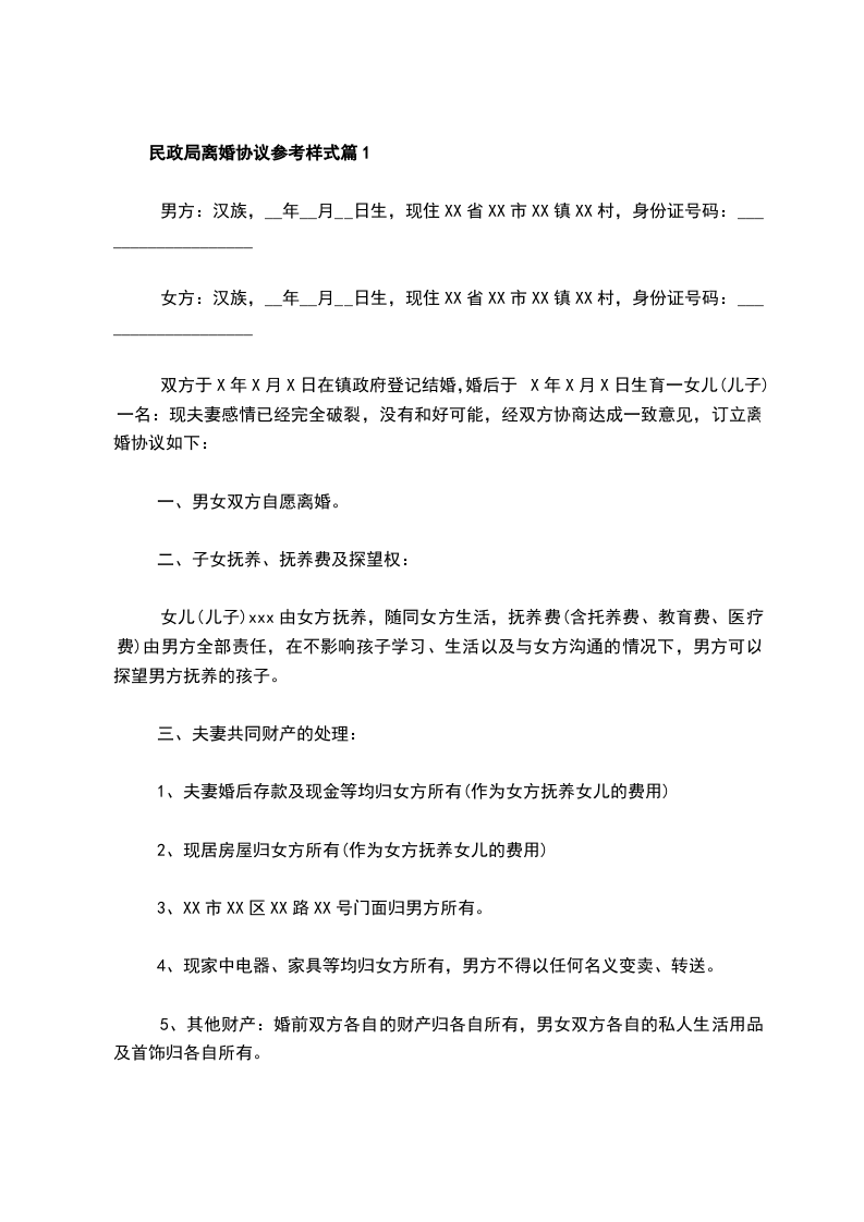 双方于X年X月X日在镇政府登记结婚,婚后于X年X月X日生育一女儿(儿子)一名:现夫妻感情已经完全破裂,没有和好可能,经双方协商达成一致意见,订立离婚协议如下: