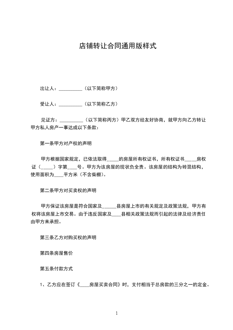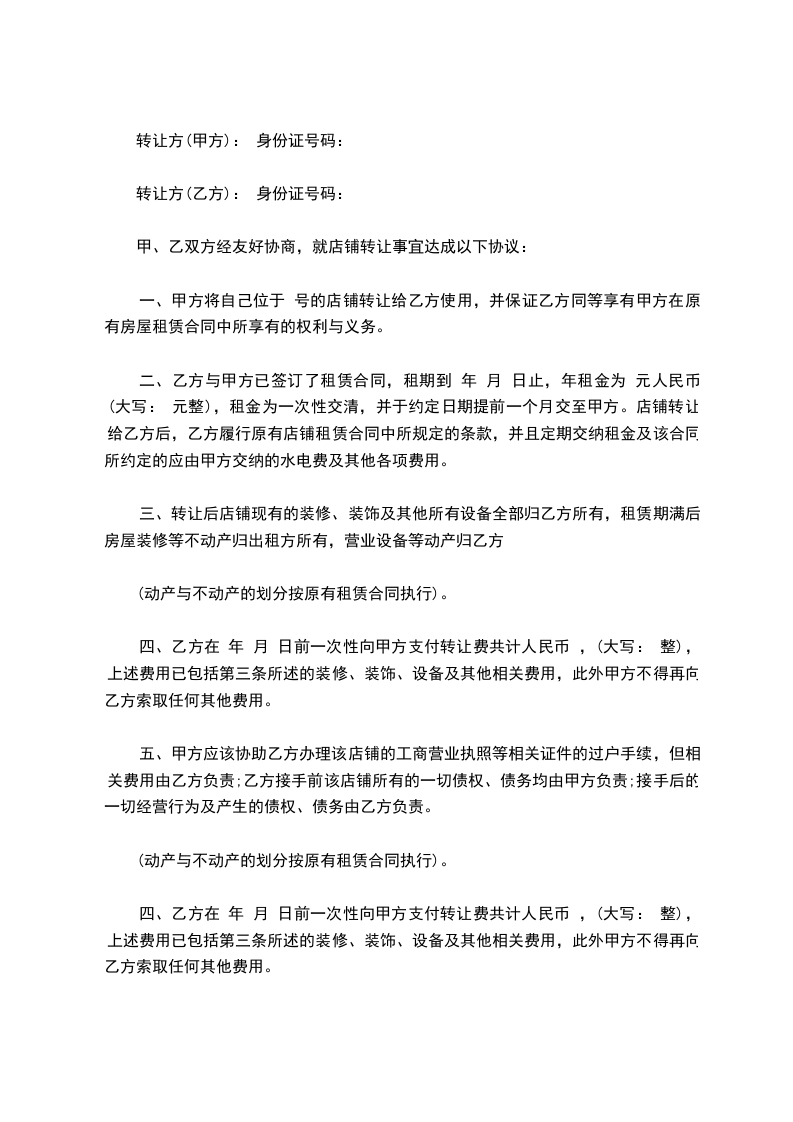 一、甲方将自己位于____________街____号的店铺(原为:________________)转让给乙方使用,并保证乙方同等享有甲方在原有房屋租赁合同中所享有的权利与义务。