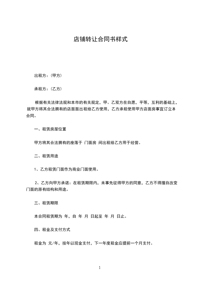 二、乙方与甲方已签订了租赁合同,租期到________年____月____日止,年租金为________元人民币(大写:____________元整),租金为一次性交清,并于约定日期提前____个月交至甲方。店铺转让给乙方后,乙方履行原有店铺租赁合同中所规定的条款,并且定期交纳租金及该合同所约定的应由甲方交纳的水电费及其他各项费用。