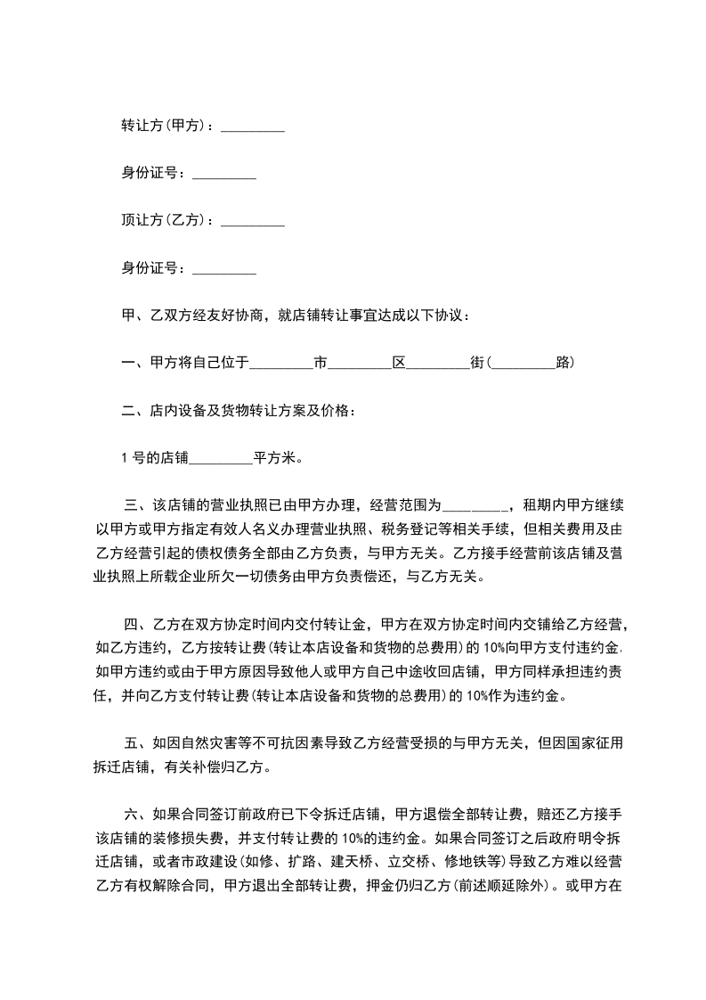 甲、乙双方经友好协商,就店铺转让事宜达成以下协议: