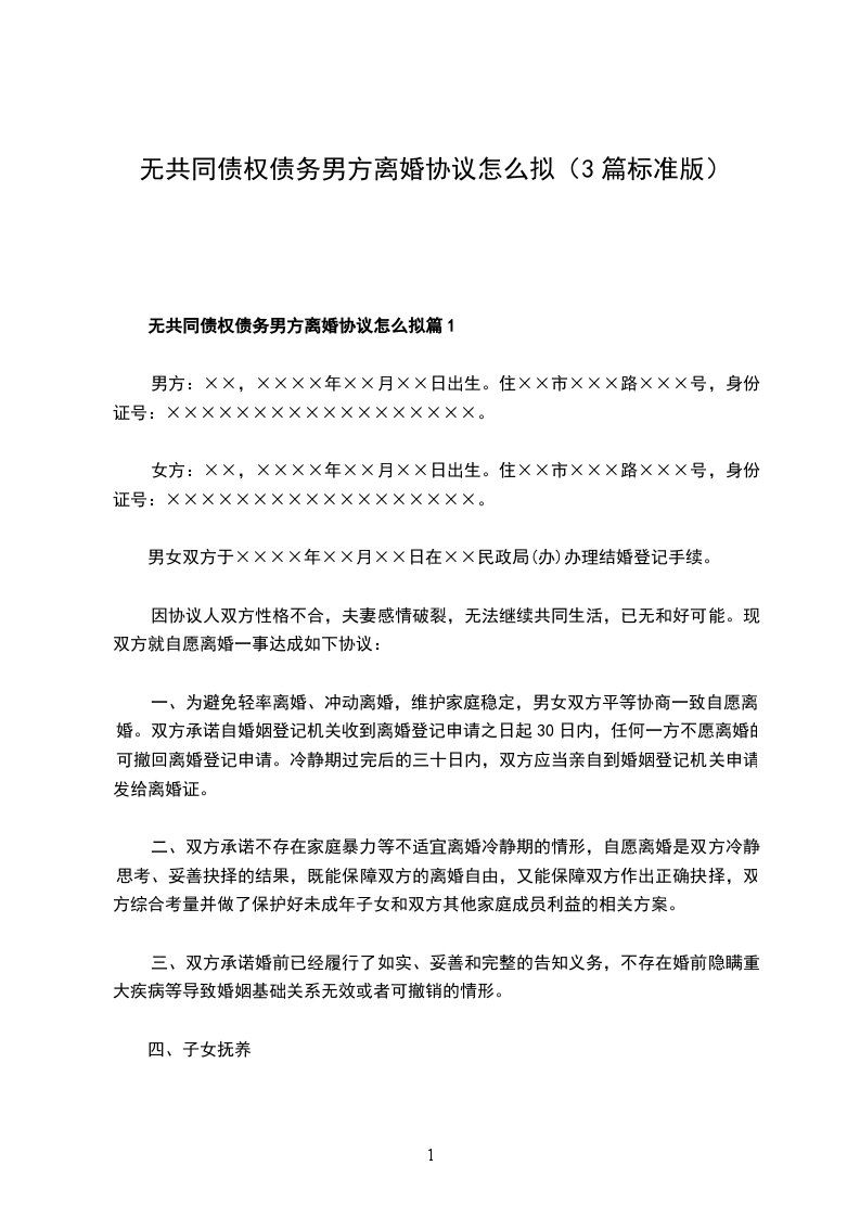 八、本协议一式三份,男、女双方各执一份,婚姻登记机关存档一份,自婚姻登记机颁发《离婚证》之日起生效。九、如本协议生效后在执行中发生争议的,双方应协商解决,协商不成,任何一方均可向相关人民法院起诉。