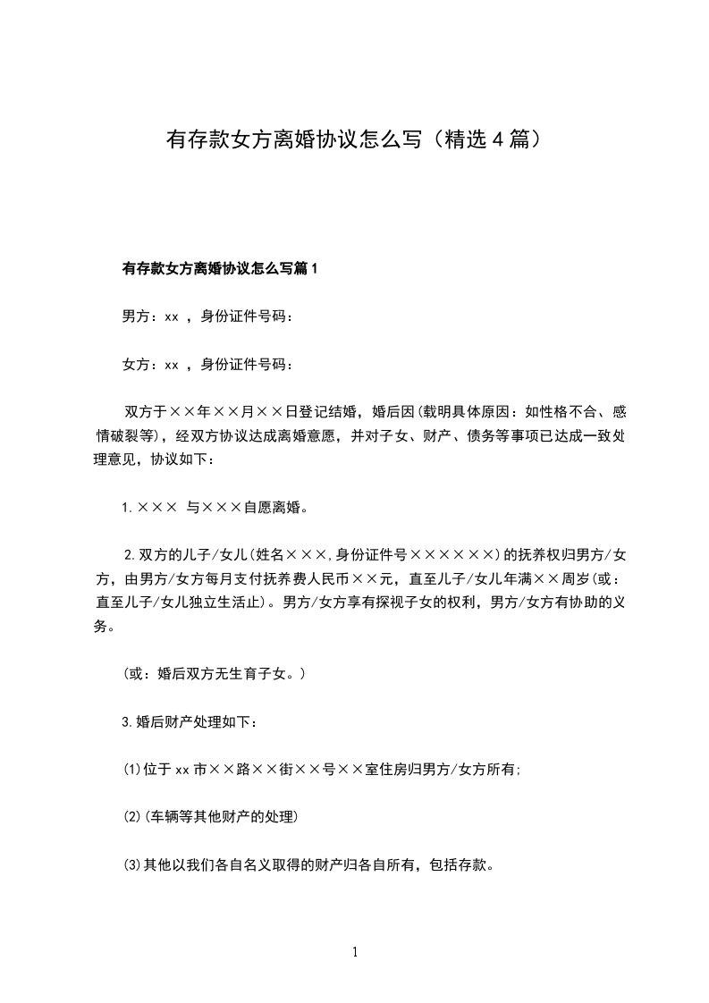 有存款女方离婚协议怎么写篇1