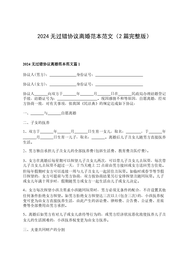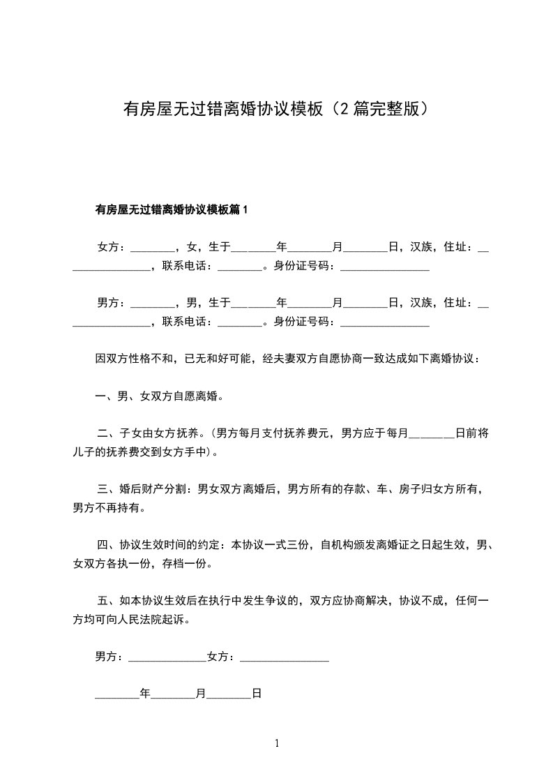 有房屋无过错离婚协议模板篇1