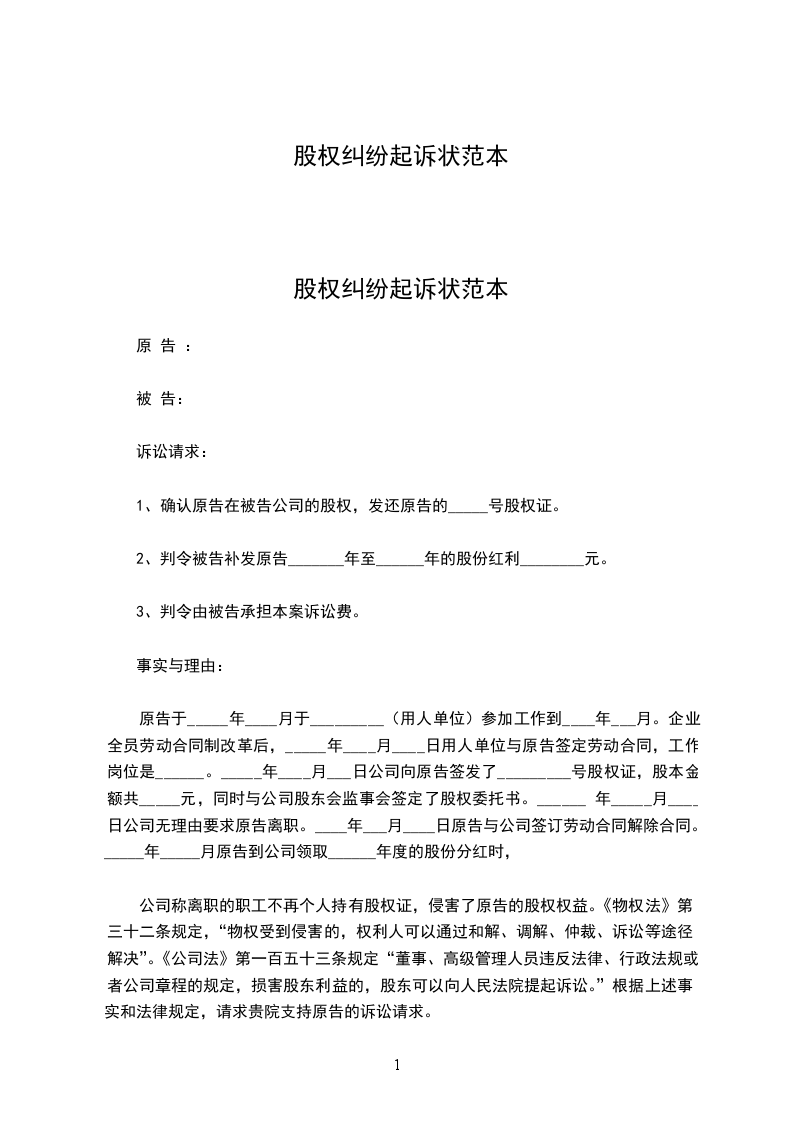 原告于_____年____月于_________(用人单位)参加工作到____年___月。企业全员劳动合同制改革后,_____年____月____日用人单位与原告签定劳动合同,工作岗位是______。_____年____月___日公司向原告签发了_________号股权证,股本金额共_____元,同时与公司股东会监事会签定了股权委托书。______年_____月____日公司无理由要求原告离职。____年___月____日原告与公司签订劳动合同解除合同。_____年_____月原告到公司领取______年度的股份分红时,公司称离职的职工不再个人持有股权证,侵害了原告的股权权益。