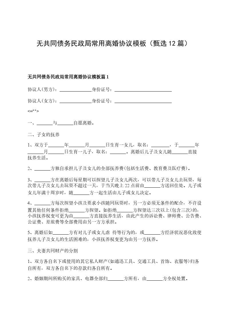无共同债务民政局常用离婚协议模板篇12