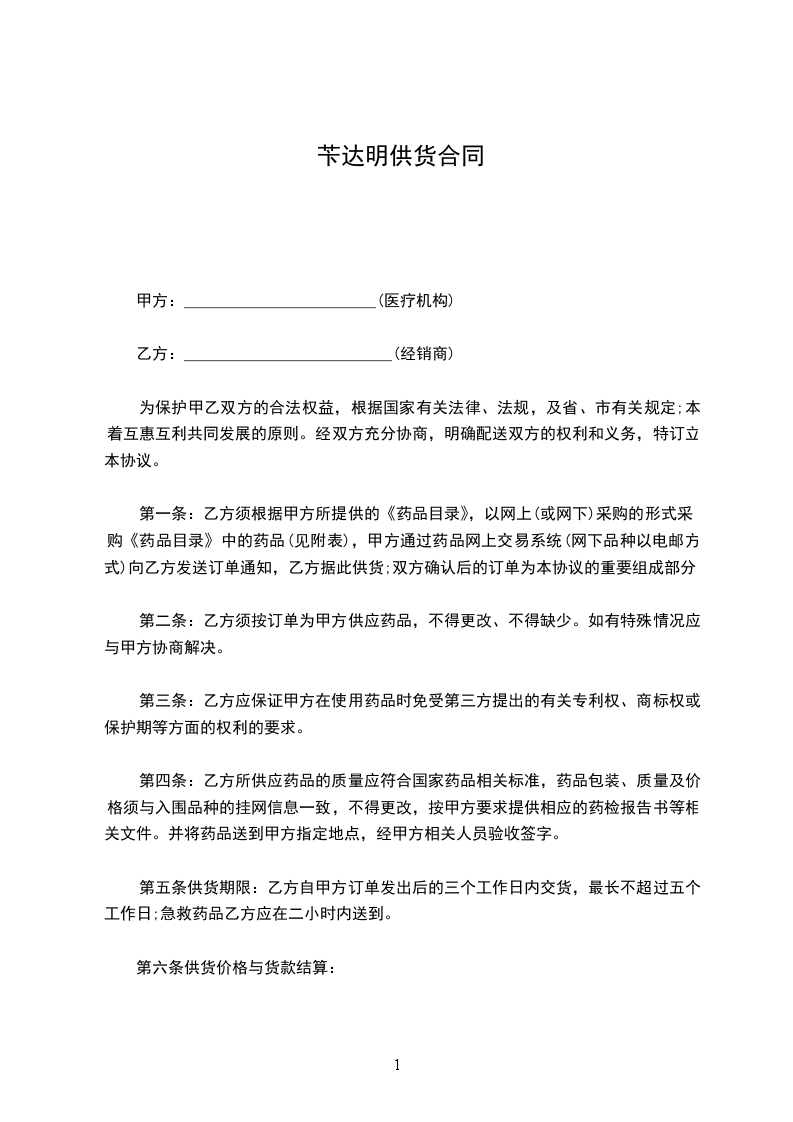 第二条:乙方须按订单为甲方供应药品,不得更改、不得缺少。如有特殊情况应与甲方协商解决。