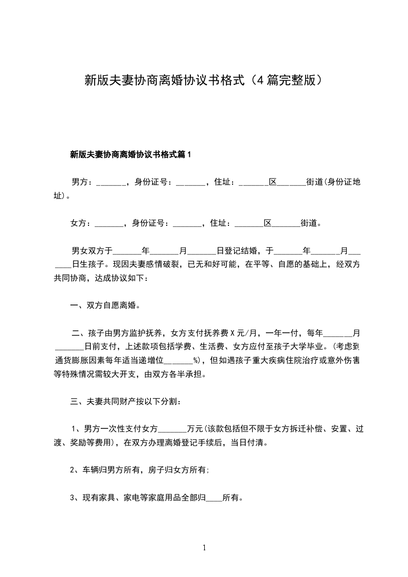 新版夫妻协商离婚协议书格式篇1