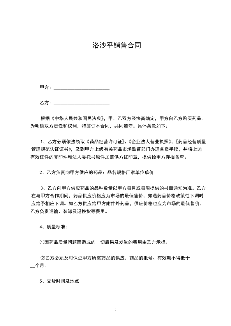 根据《中华人民共和国民法典》,甲、乙双方经协商确定,甲方向乙方购买药品。为明确双方责任和权利,特签订本合同,共同遵守。具体条款如下: