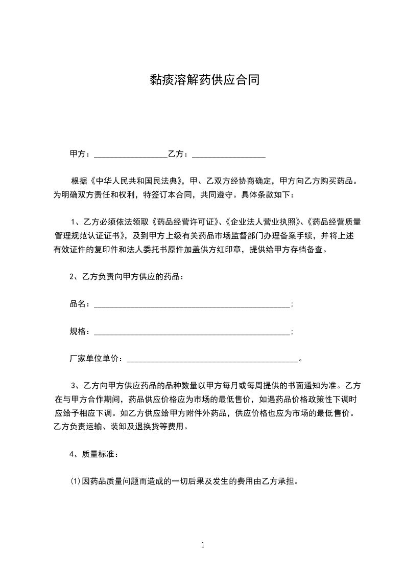 根据《中华人民共和国民法典》,甲、乙双方经协商确定,甲方向乙方购买药品。为明确双方责任和权利,特签订本合同,共同遵守。具体条款如下: