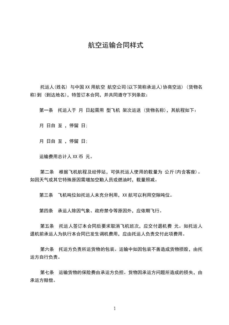 托运人(姓名) 与中国XX用航空 航空公司(以下简称承运人)协商空运) (货物名称)到 (到达地名),特签订本合同,并共同遵守下列条款: