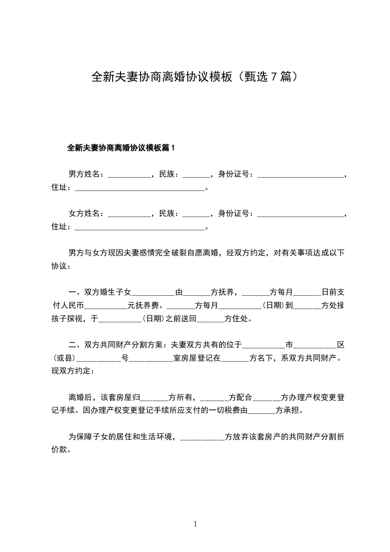 全新夫妻协商离婚协议模板篇1