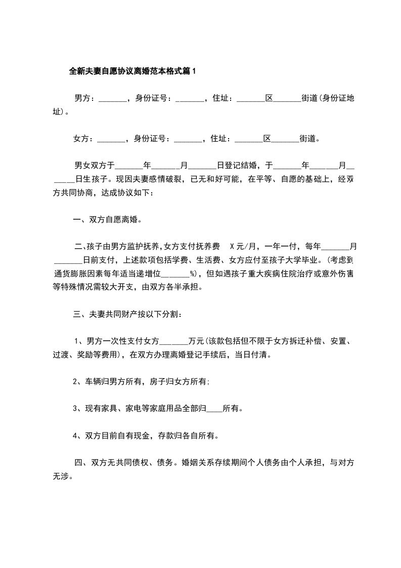 男方与女方于 年 月认识,于 年 月 日在 登记结婚,婚后于 年 月 日生育一儿子/女儿,名 。因 致使夫妻感情破裂,已无和好可能,现经夫妻双方自愿协商达成一致意见,订立离婚协议如下: