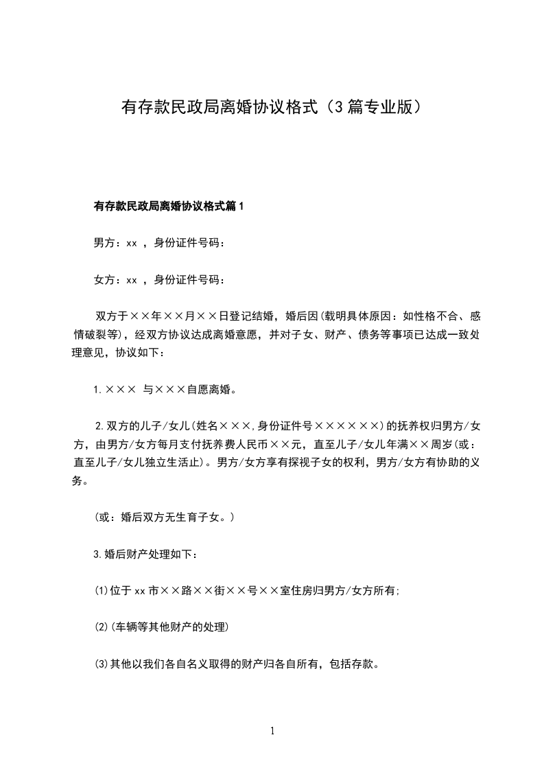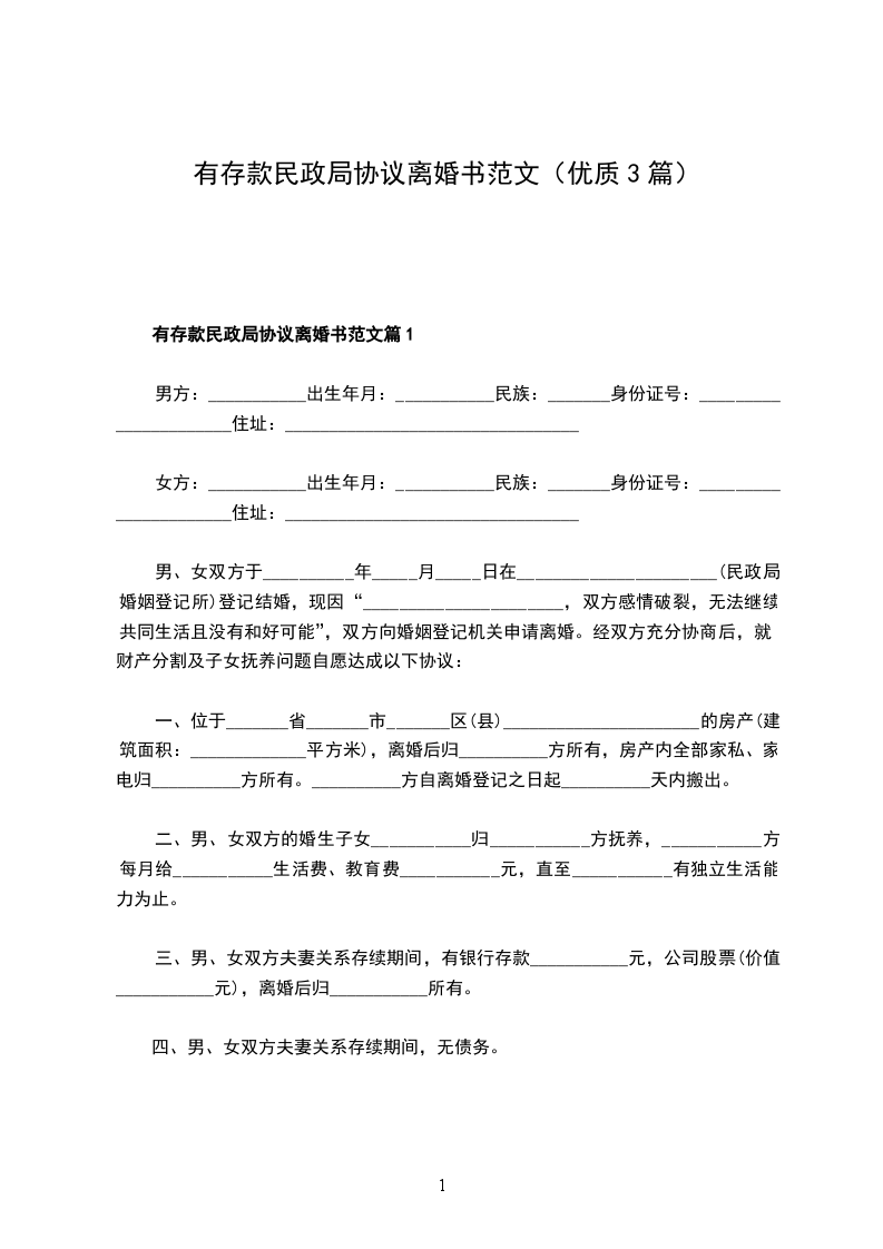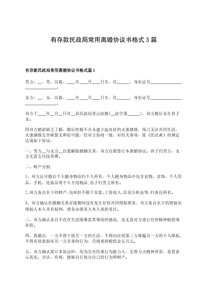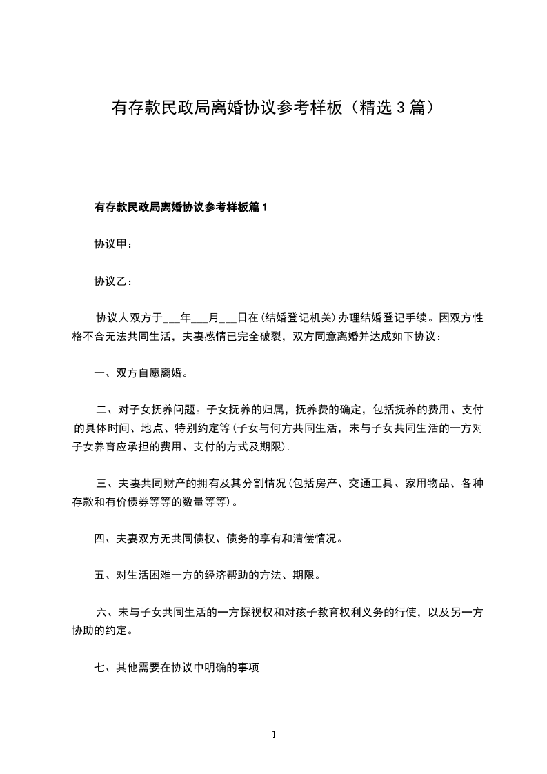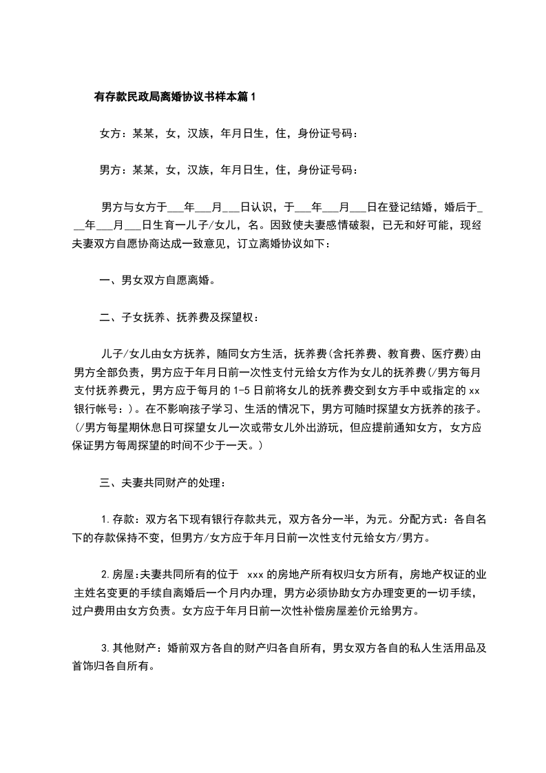 有存款民政局离婚协议参考样板篇3