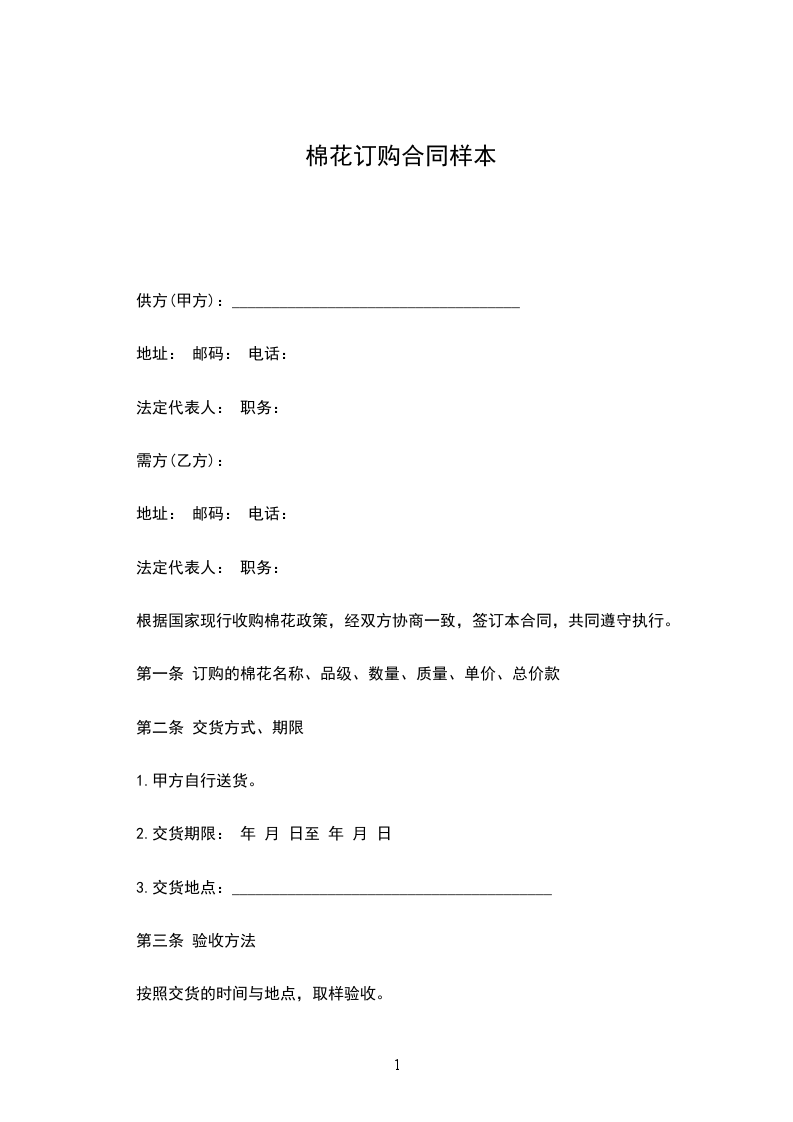 第一条 订购的棉花名称、品级、数量、质量、单价、总价款