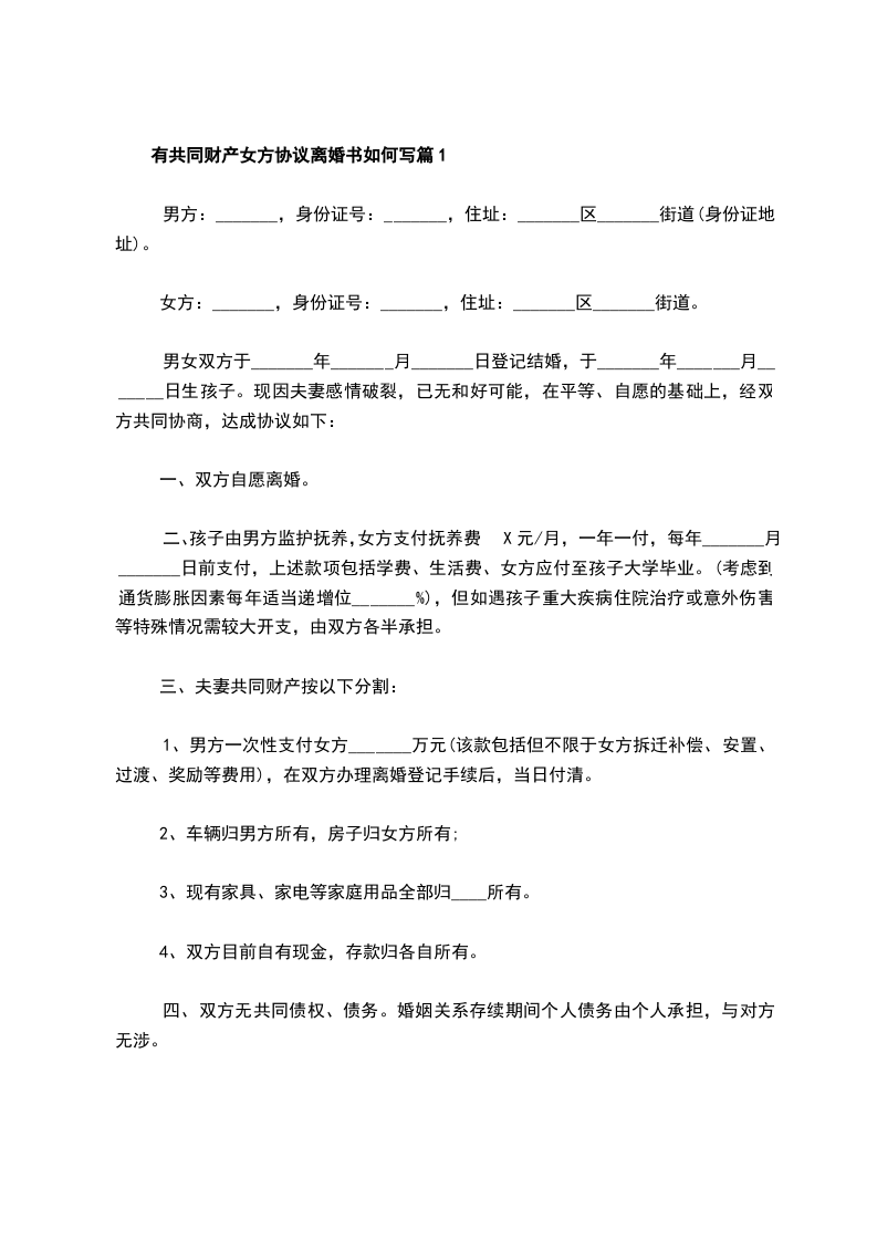 有共同财产女方协议离婚书如何写篇9