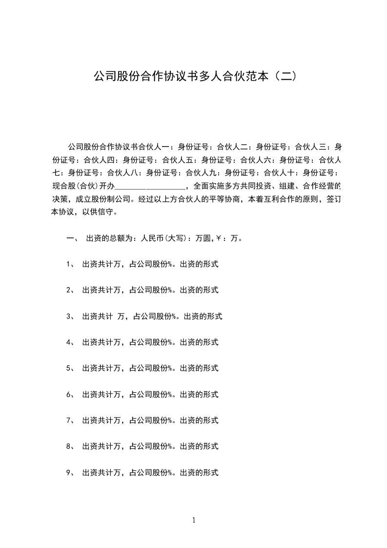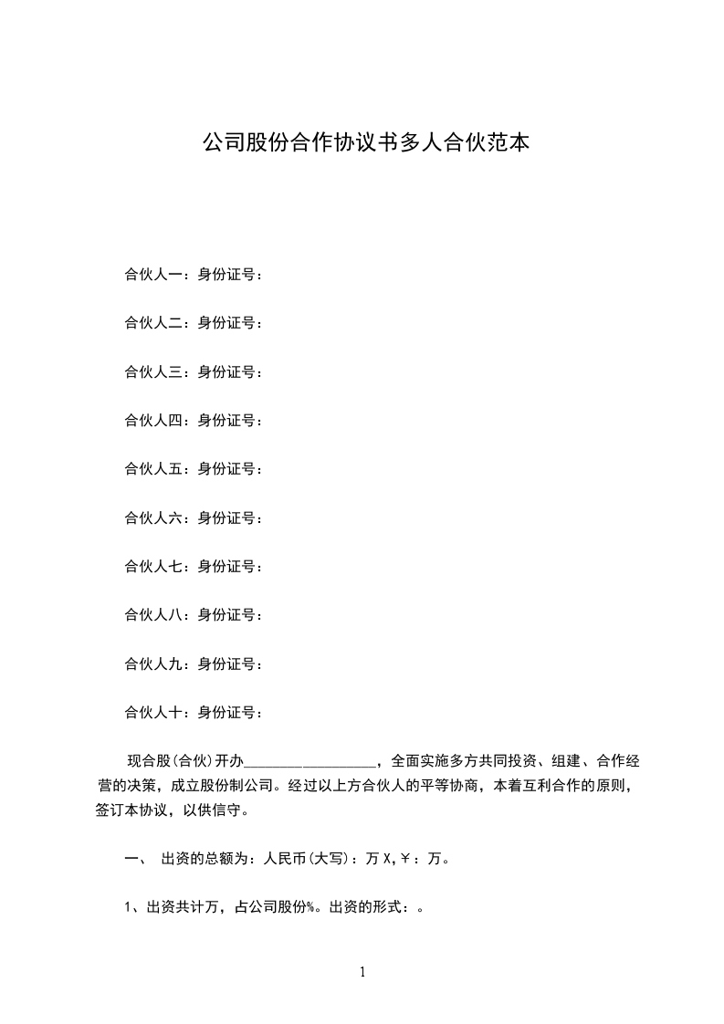 现合股(合伙)开办__________________,全面实施多方共同投资、组建、合作经营的决策,成立股份制公司。经过以上方合伙人的平等协商,本着互利合作的原则,签订本协议,以供信守。