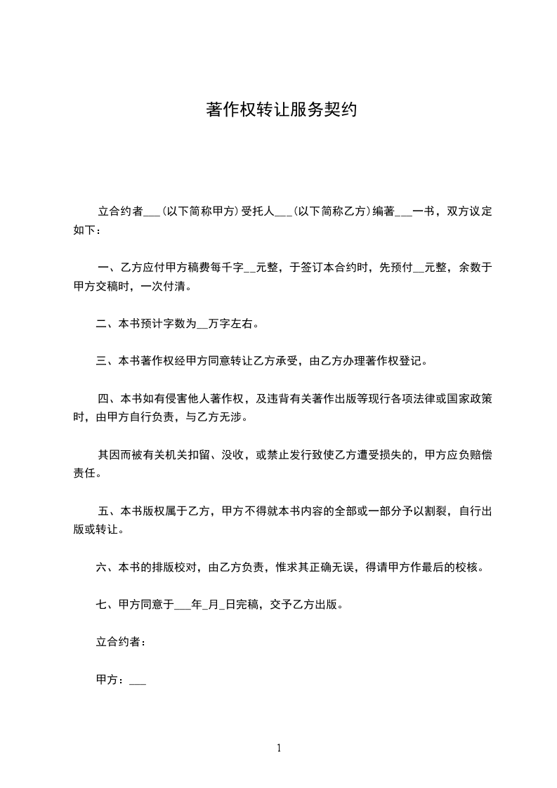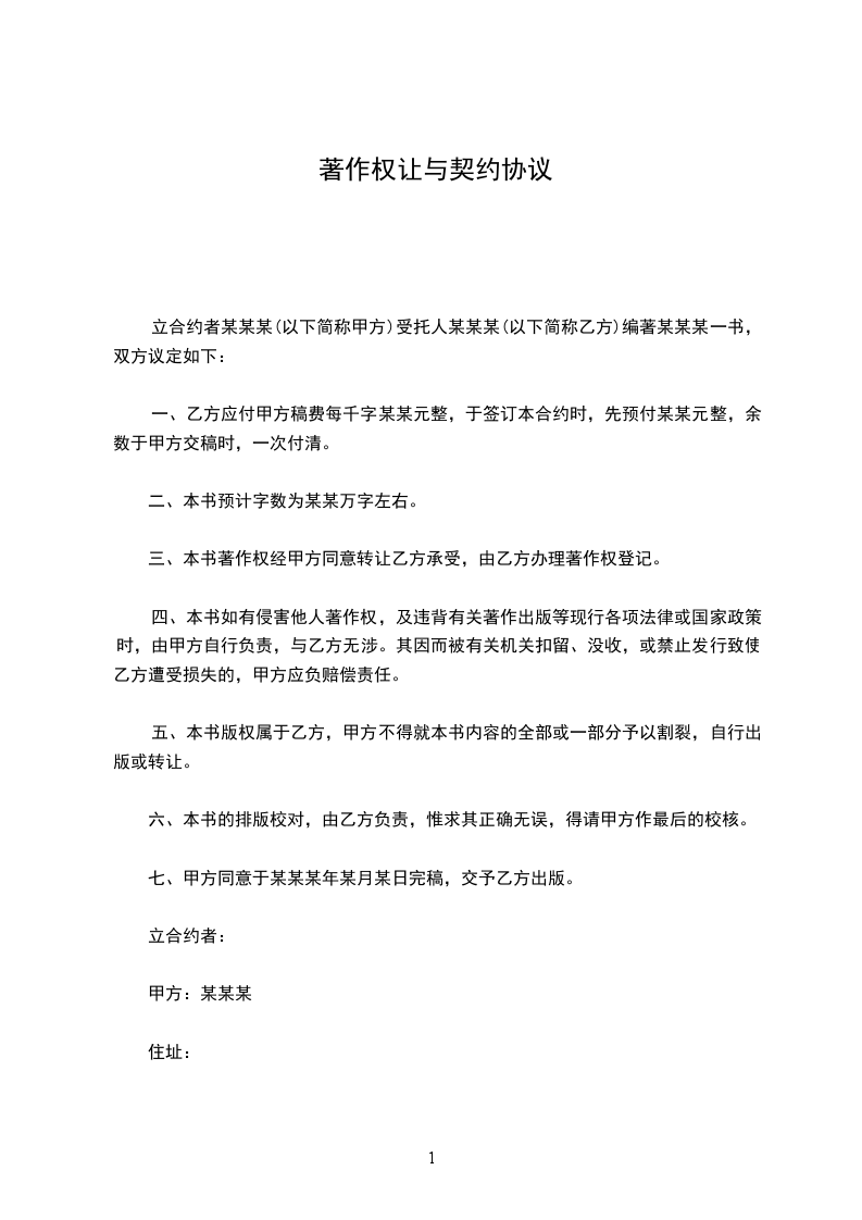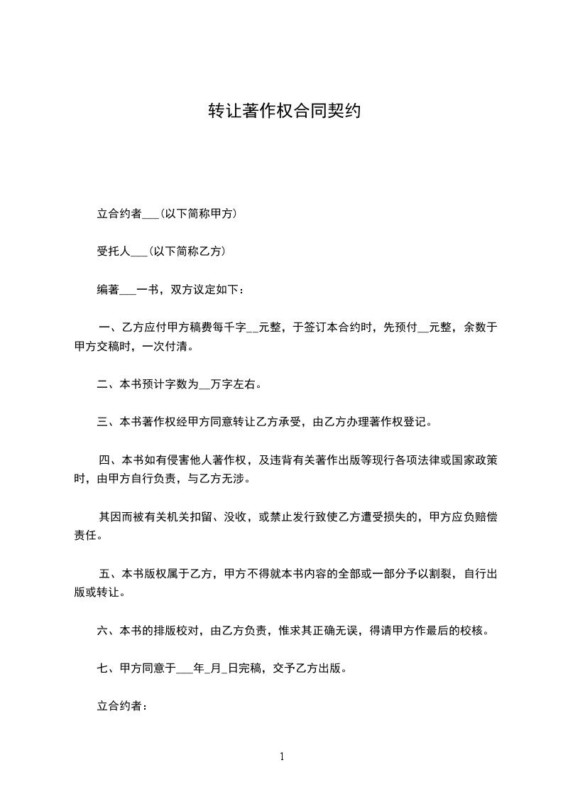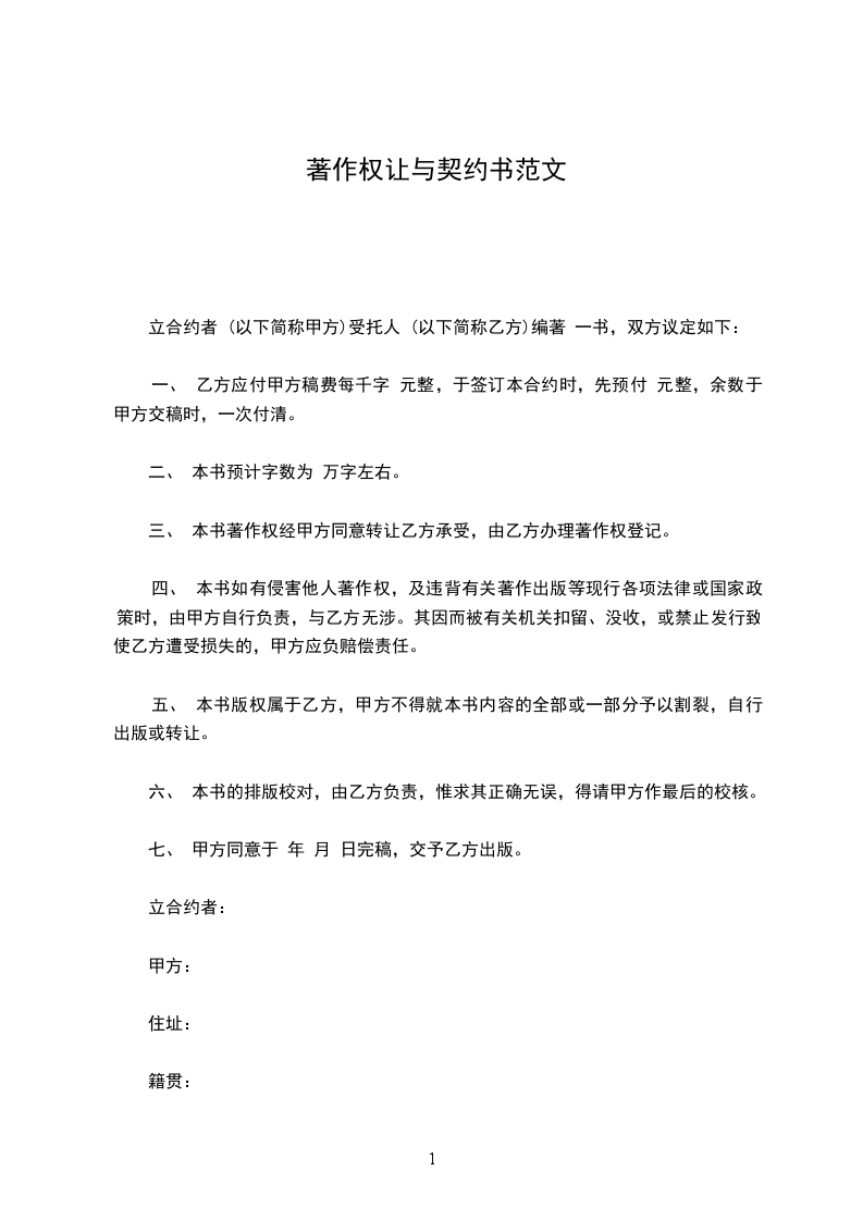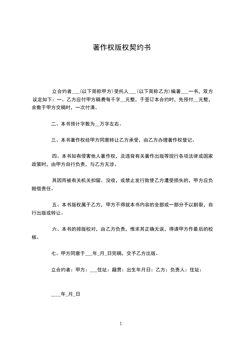 一、 乙方应付甲方稿费每千字 元整,于签订本合约时,先预付 元整,余数于甲方交稿时,一次付清。