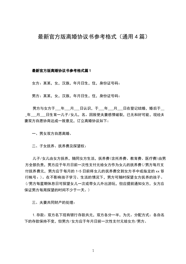 最新官方版离婚协议书参考格式篇1